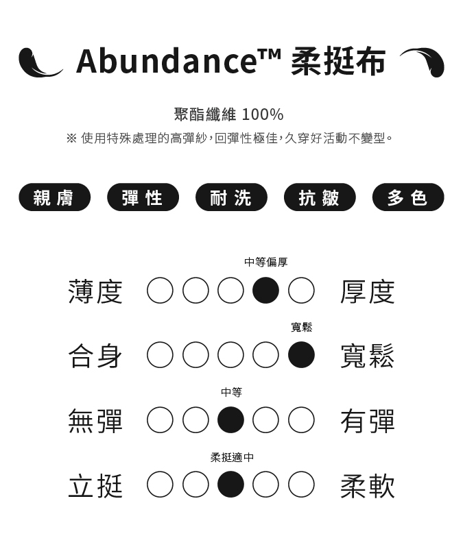 • 使用特殊處理的高彈紗,回彈性極佳,久穿好活動不變型