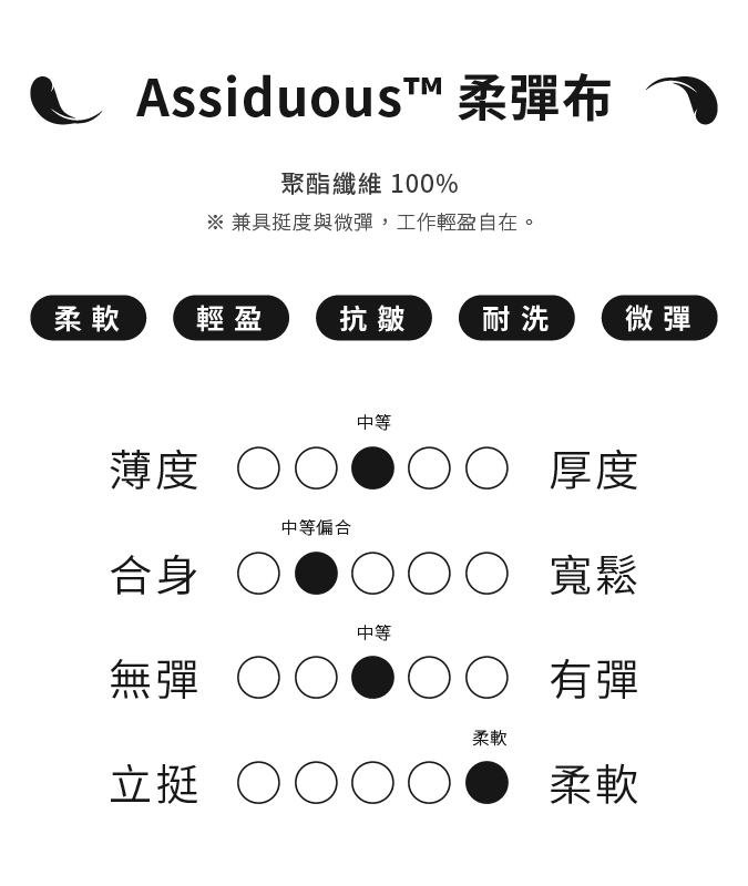 .柔軟輕盈降低穿著負擔、抗皺耐洗的便利特性