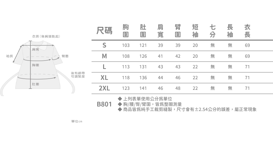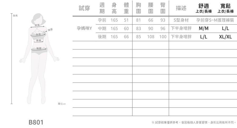 .此款胸腰臀已有放寬,孕媽咪可依肩寬及胸圍挑選尺寸
