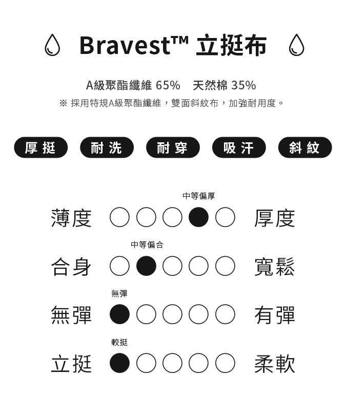 .採用Bravest™ 立挺布 (T/C斜紋含棉布)