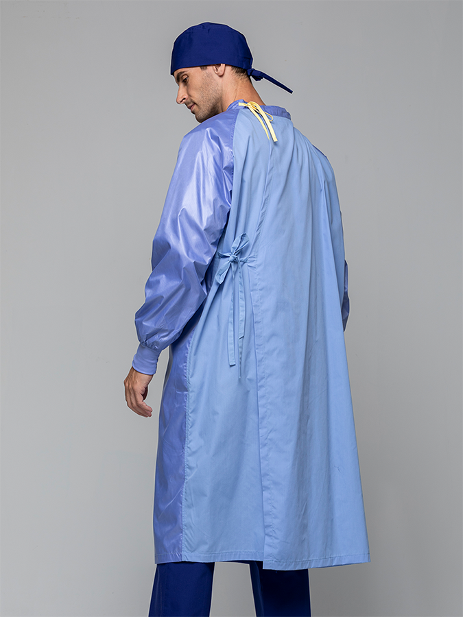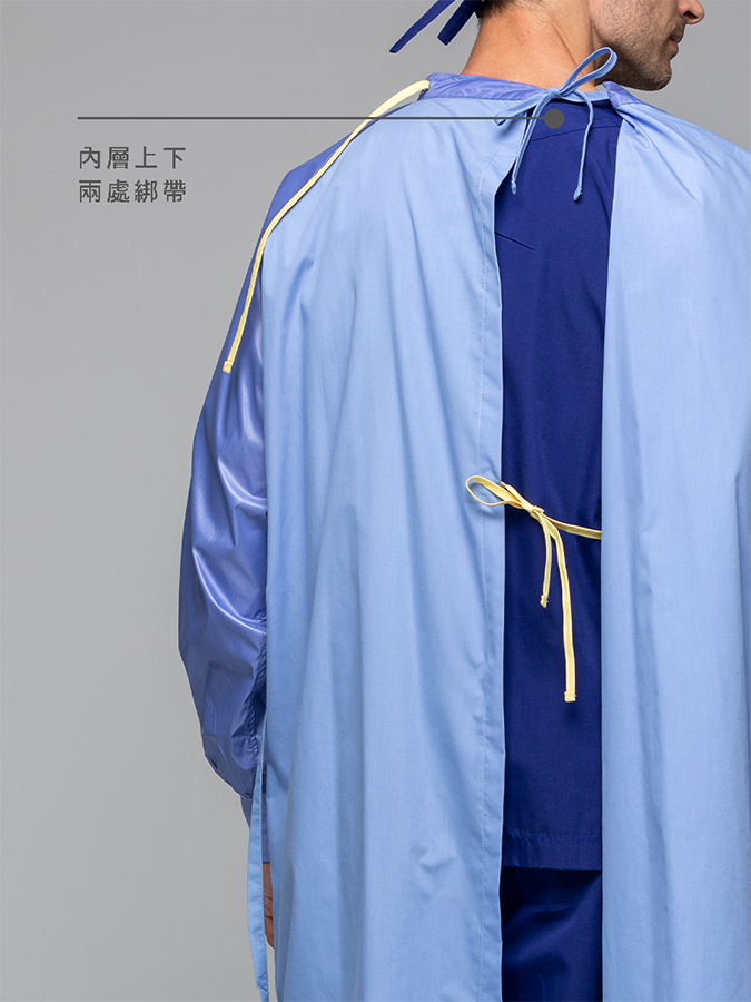 .反穿式隔離防護,後背交疊4綁帶固定。