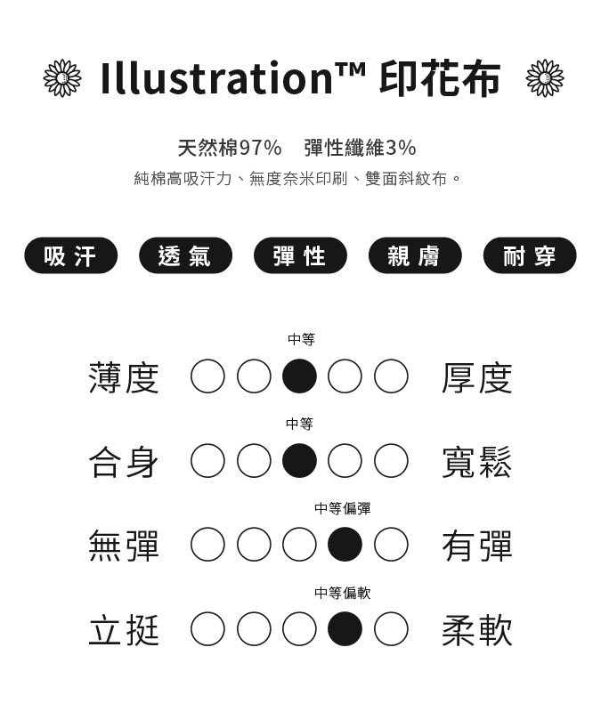 .雙面斜紋組織觸感佳、棉質高吸汗性優良、彈性好活動