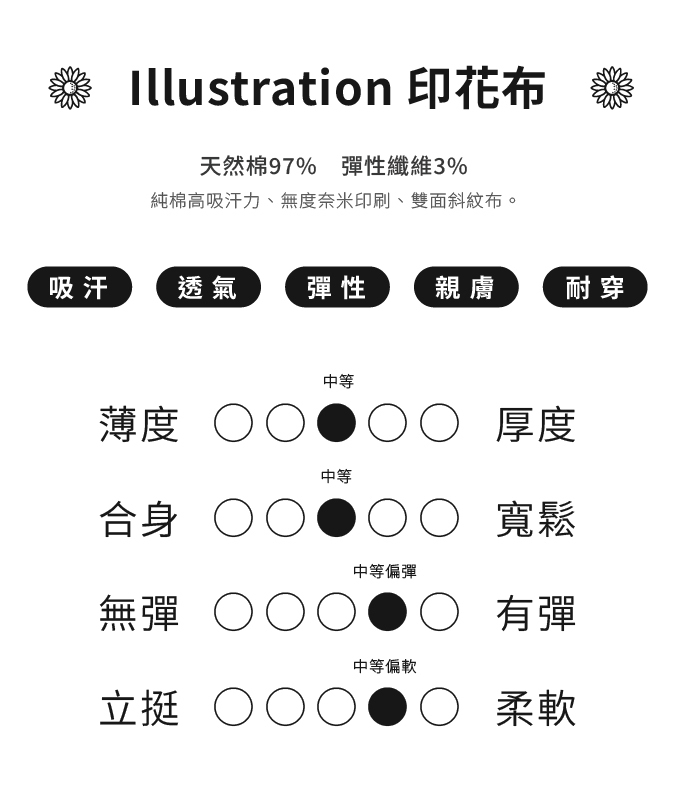 .雙面斜紋組織觸感佳、棉質高吸汗性優良、彈性好活動